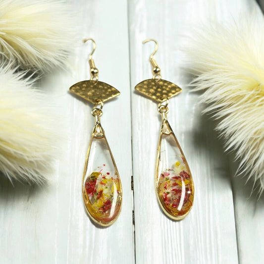 Boucles d'Oreilles goutte d'eau en résine et fleurs séchées