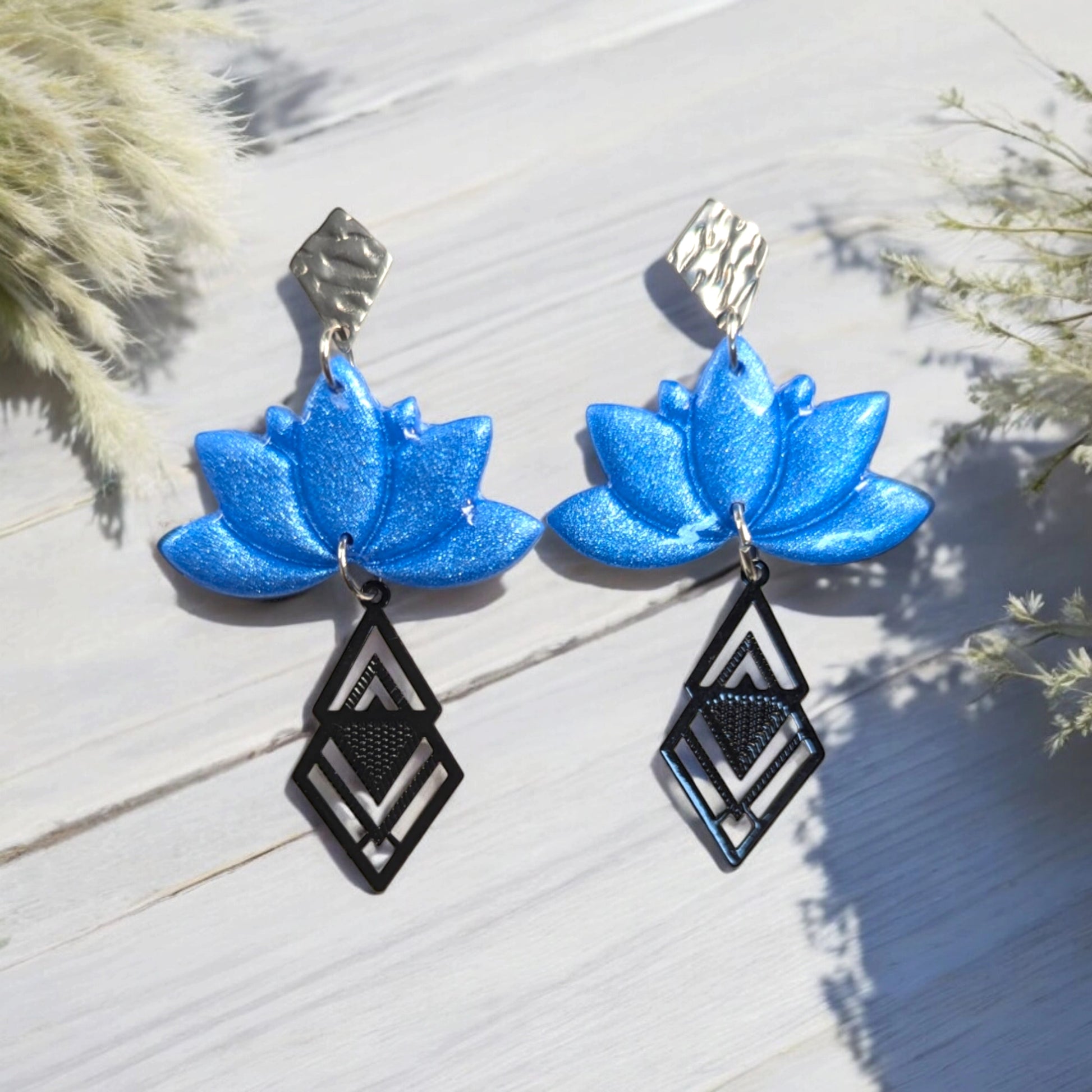 Boucles d'oreilles Uniques Lotus argile polymere et acier inoxydable
